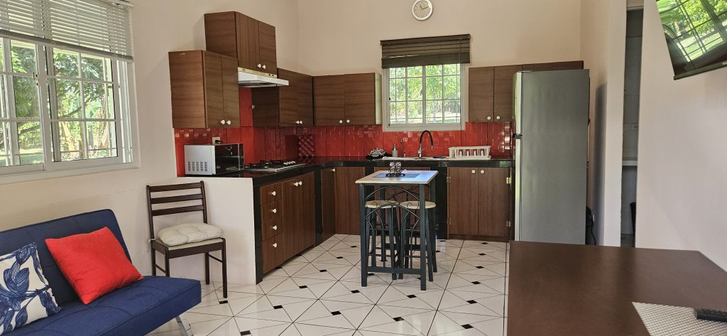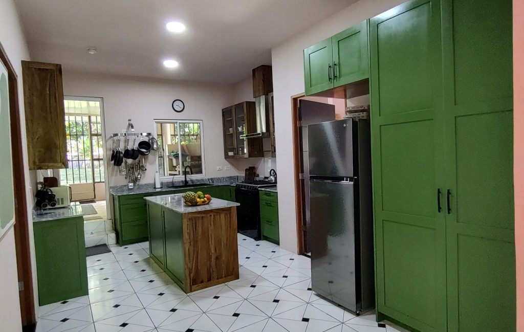 The main home, shown on the right in the above photo, all furnishings included, features two master suites and a new kitchen that opens onto a fully screened front and back porch. The Laurel cabinets were made by a good friend who is also a neighbor. A screened carport connects the two porches and a tool room, a new washer/drier, a deep sink and outdoor cooking area. A Starlink antenna on the roof provides internet and WiFi for all three homes. The property has two wells, with the primary one pumping fresh water up to a 2000 gallon tank. A pressure tank feeds water through a series of sediment filters and an ultraviolet purification system to deliver clean drinking water to all three homes. The second well also has a 2000 gallon storage tank but no sediment filters as it supplies only irrigation water for the greenhouse and grounds during dry season (January thru April).